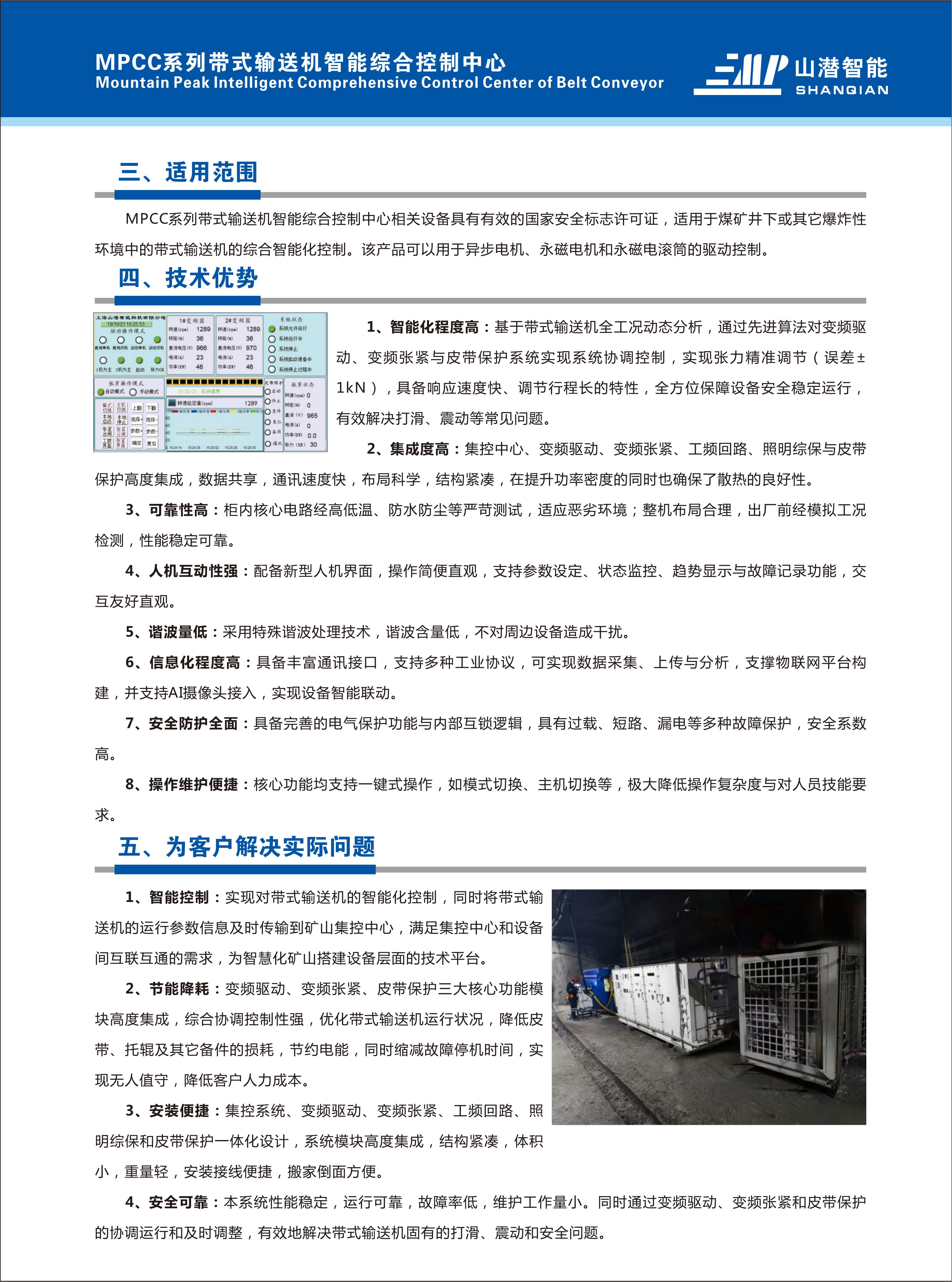 MPCC系列帶式輸送機智能綜合控制中心集成集控中心、變頻驅動、變頻張緊、工頻回路、照明綜保及皮帶保護等主要功能模塊,實現各主要功能模塊的無縫協同,真正實現帶式輸送機的綜合智能化控制。本產品具備自主知識產權,技術先進,性能可靠。